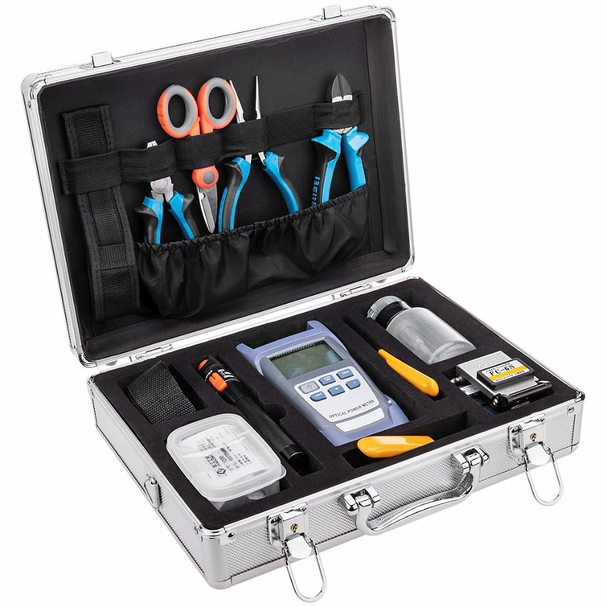 Trousse à outils comprenant tout le nécessaire pour mener à bien des projets d’installation ou de maintenance à fibres optiques. Tous ces outils sont inclus dans une valise en aluminium pratique, facilement transportable en cas de besoin. L’intérieur de la valise est rembourré pour protéger le matériel et les outils électroniques. Spécifications Trousse à outils comprenant tout le nécessaire pour mener à bien des projets d’installation ou de maintenance à fibres optiques. Valise en aluminium pratique, facilement transportable en cas de besoin. Emetteur de localisation de défauts 1mW 650nm jusqu’à 5 km (# CT62). Wattmètre optique 850-1625nm FC / SC (similaire à notre référence # CT41). Coupeur de précision à fibres optiques FC-6S (# TK25), avec adaptateur de mesure de coupure (# FM70). Éplucheur de câbles 2-3mm, 250μm, 125μm (# HO53) et un éplucheur à fibres optiques (# HO08). Flacon doseur pour le nettoyage de 50 ml (# HO10). Comprend les pinces universelles, les pinces coupantes, les pinces à bec fin, les ciseaux à usages multiples et les lingettes. Taille du boîtier: 350 x 105 x 285 mm.