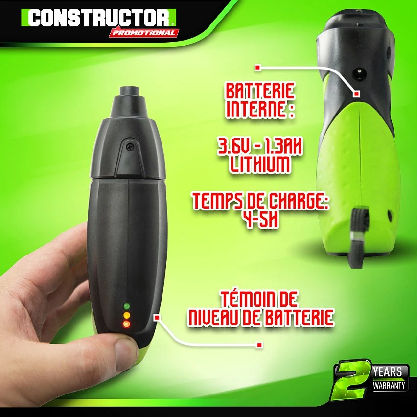 Livré avec 10 embouts de vissage : PH1 – PH2 – PH3 – PZ1 – PZ2 – PZ3 – H2 – T10 – plat 4 et 6