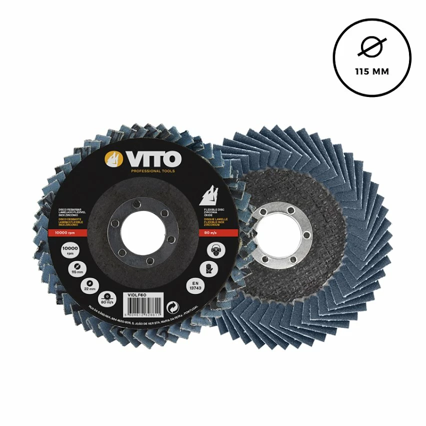 Disque à lamelle VITOPOWER flexible zirconium d’un diamètre de 115 mm et un alésage de 22 mm son grain est de 100. 80 m/s