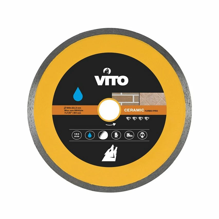 Disque diamant coupe humide VITOPOWER avec un diamètre de 180 mm, un alésage de 22 mm, 80 m/s. EN 13236