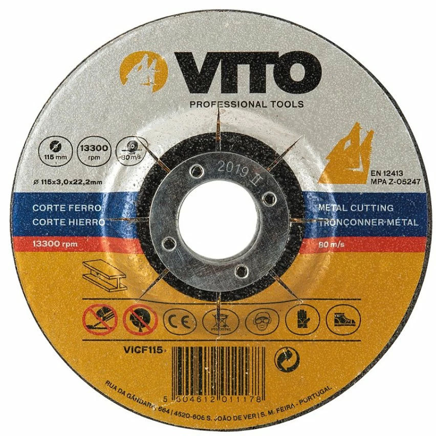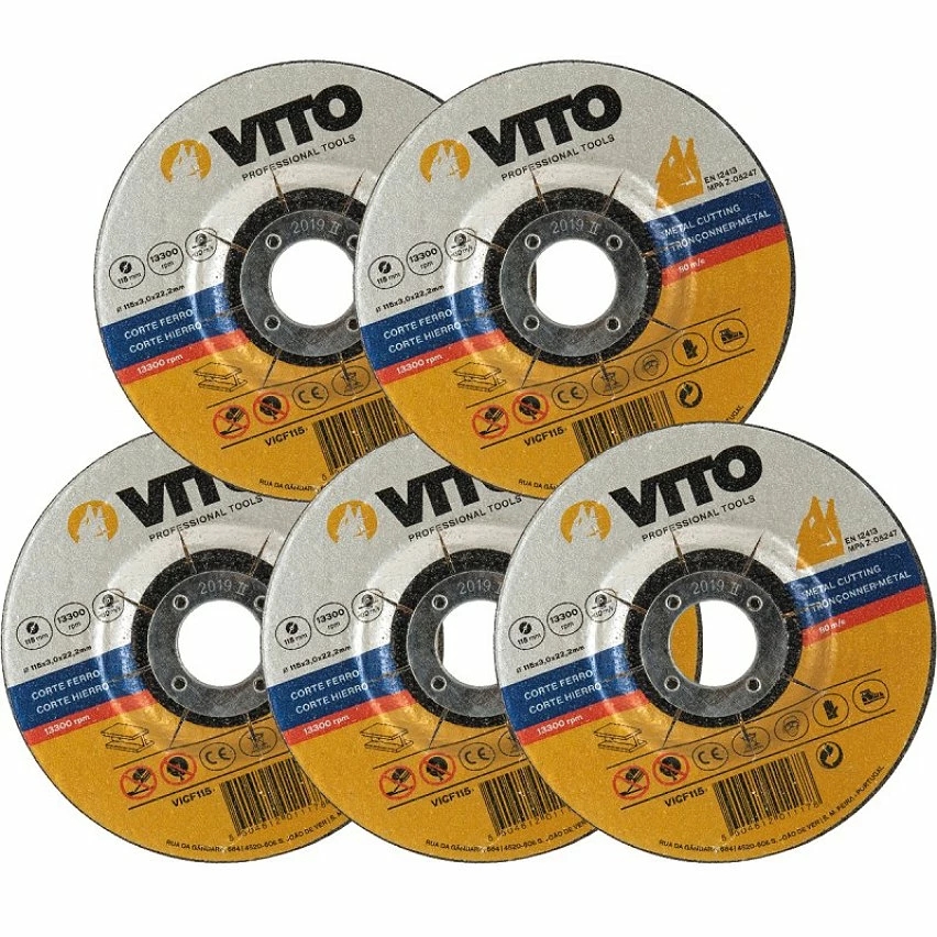 5 Disques à tronçonner le métal VITO diamètre 115mm alésage 22,2 mm épaisseur 3 mm avance maximum 80 m/s 13300 tr/mn.