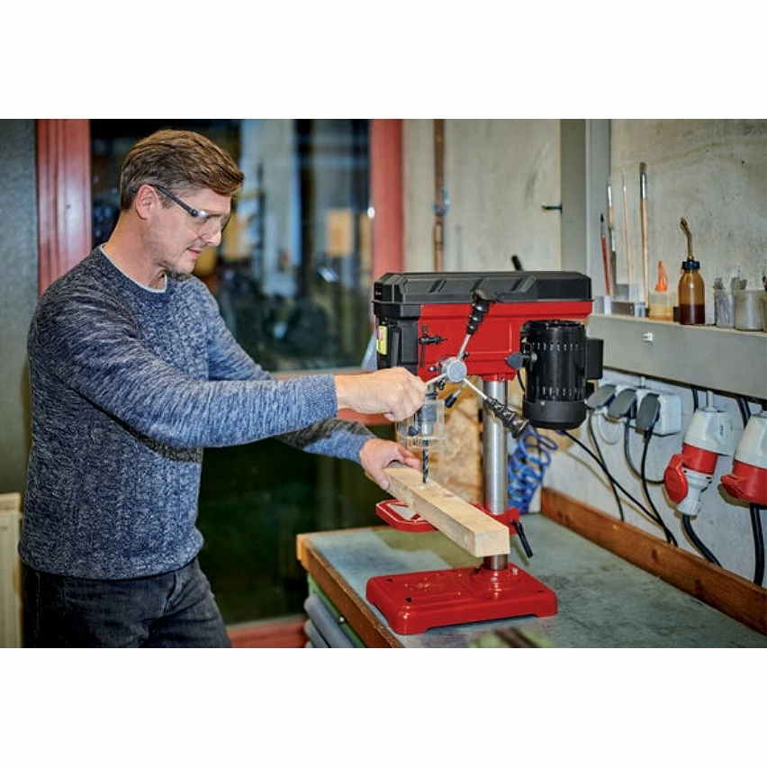 La perceuse à colonne TC-BD 500 Einhell est un outil précis répondant à des besoins spécifiques : avec sa grande surface portante de 115 mm, elle est très efficace pour percer avec exactitude des pièces en bois ou en métal de grande taille. Avec une puissance de 500 W et 9 niveaux de vitesse de 300 à 2 410 tr/minute, elle réalise des perçages précis adaptés au matériau. La perceuse à colonne peut ainsi fonctionner aussi bien à des vitesses très basses que très élevées, et est donc parfaitement adaptée tant aux matériaux durs comme le métal qu’aux matériaux tendres comme le bois. La butée de profondeur réglable permet de réaliser des perçages précis. La profondeur de perçage maximale est de 50 mm. La perceuse à colonne est équipée d’un mandrin à couronne dentée robuste et d’un mandrin MK2 qui lui permettent de recevoir des forets à cône Morse et les forets usuels de diamètre compris entre 1,5 et 13 mm. La broche de perçage sur roulement à billes assure un fonctionnement facile et une grande longévité. La perceuse à colonne est modulable, la hauteur de sa table de perçage s’ajustant en continu. La table de perçage pivote jusqu’à 90° et s’incline jusqu’à 45°. Le tourniquet caoutchouté à trois bras produit un effet de levier qui permet d’appliquer sans effort la pression de perçage exacte. La sécurité en fonctionnement est assurée par le pare-copeaux rabattable, et l’interrupteur marche/arrêt avec déclencheur à tension nulle prévient tout redémarrage accidentel après une panne de courant.