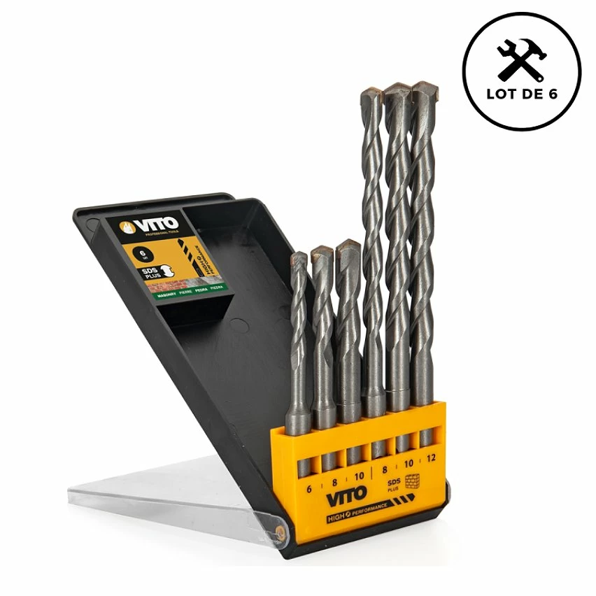 Set de 6 forets VITO PRO-POWER SDS-PLUS pour percer la PIERRE. Diamètres : 6 | 8 | 10 | 12 mm – Livré en coffret