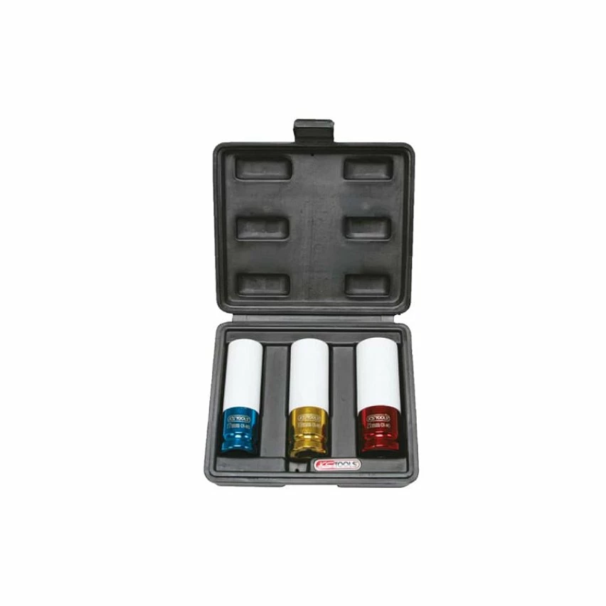 Jeu de 3 douilles à chocs KS TOOLS Pour jantes aluminium – 04-19-21mm – 1/2″ – 515.1005, douilles spéciales pour le montage démontage de roue. Possède un revêtement ABS pour ne pas endommager les jantes en aluminium.