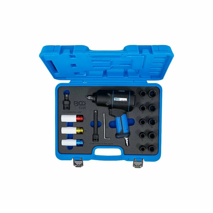 Jeu de clé à choc et douilles BGS TECHNICcontient une clé à choc pneumatique puissante et robuste, ainsi que 13 douilles à choc différentes à utiliser avec des écrous ou des têtes de vis à six pans. Ces différents éléments ont pour taille de profil de transmission métrique 12,5 mm (1/2″). Ce jeu est simple d’utilisation vous permettra de réaliser des travaux de montage sur votre véhicule.
