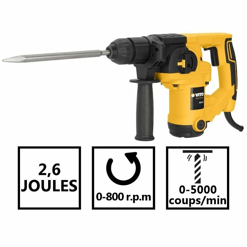 Le marteau piqueur perforateur VIMP710 de VITO délivre une puissance de 710W. Il développe une force de frappe de 2.6 Joules pour donner jusqu’à 5000 coups/min. Sa vitesse de rotation varie de 0 jusqu’à 800 tr/min. Cet appareil est équipé d’un embrayage de sécurité et il possède plusieurs mode de perçage et percussion. SDS +