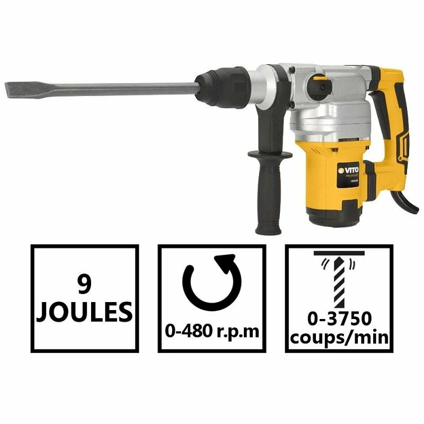 Le marteau piqueur perforateur VIMP850 de VITO délivre une puissance de 1050W. Il développe une force de frappe de 9 Joules pour donner jusqu’à 3750 coups/min. Sa vitesse de rotation varie de 0 jusqu’à 480 tr/min. Cet appareil est équipé d’un embrayage de sécurité et il possède plusieurs mode de perçage et percussion.SDS PLUS