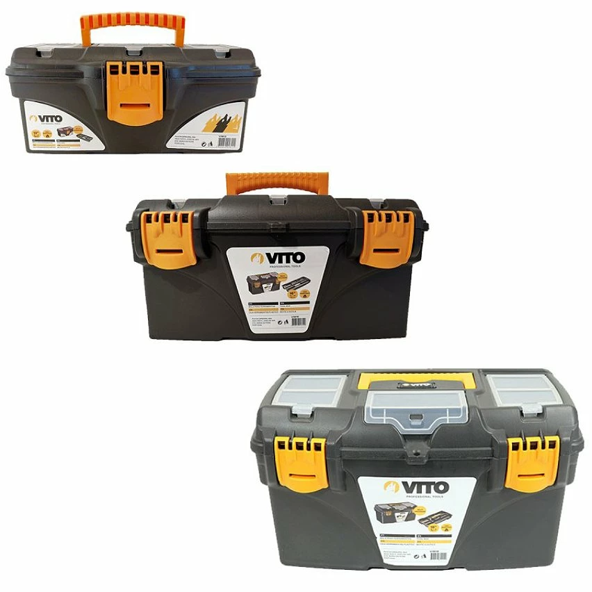 Pack de 3 caisses à outils VITO. Vous disposez de 3 tailles de caisses à outils différentes 13″, 16″ et 18″. Cela vous permet de ranger et transporter vos outils. Composées de matériaux robuste, ces boîtes à outils VITO sont dotées de poignées rétractables, d’un porte-outils amovible. Le couvercle comprend 3 compartiments pour ranger les petites pièces comme des vis ou autre.