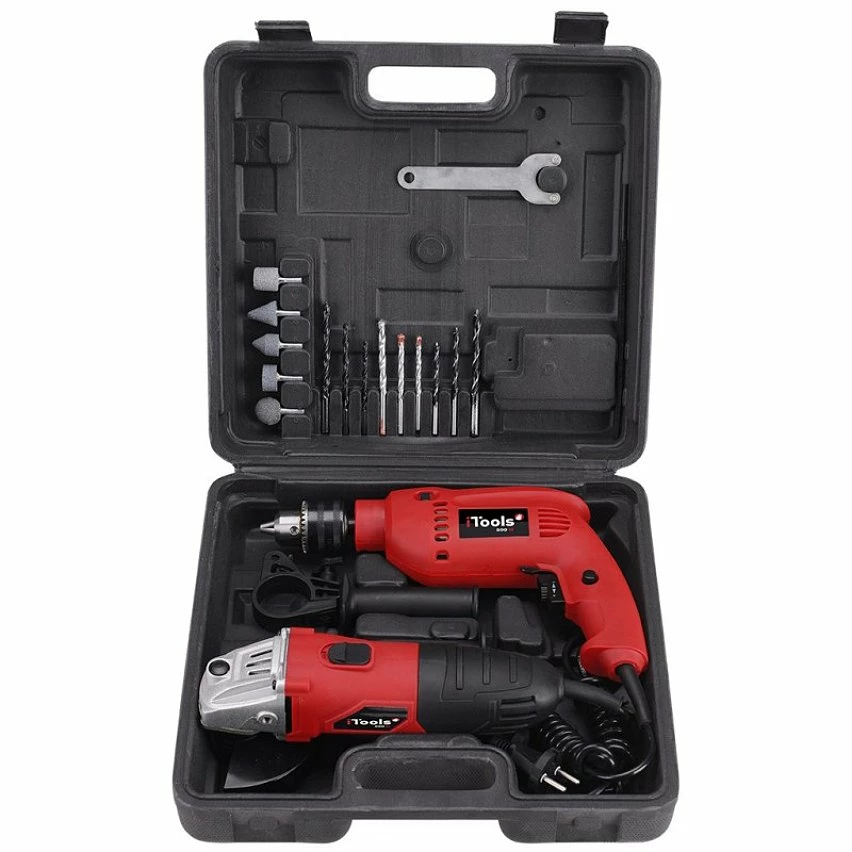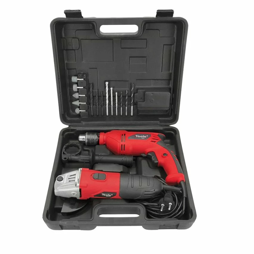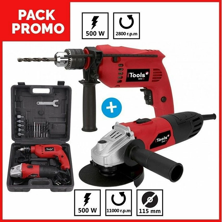 Duo pack de la gamme ITOOLS comprenant une perceuse à percussion d’une puissance 500W et une meuleuse de 500 W, livrés dans une mallette avec 17 accessoires.