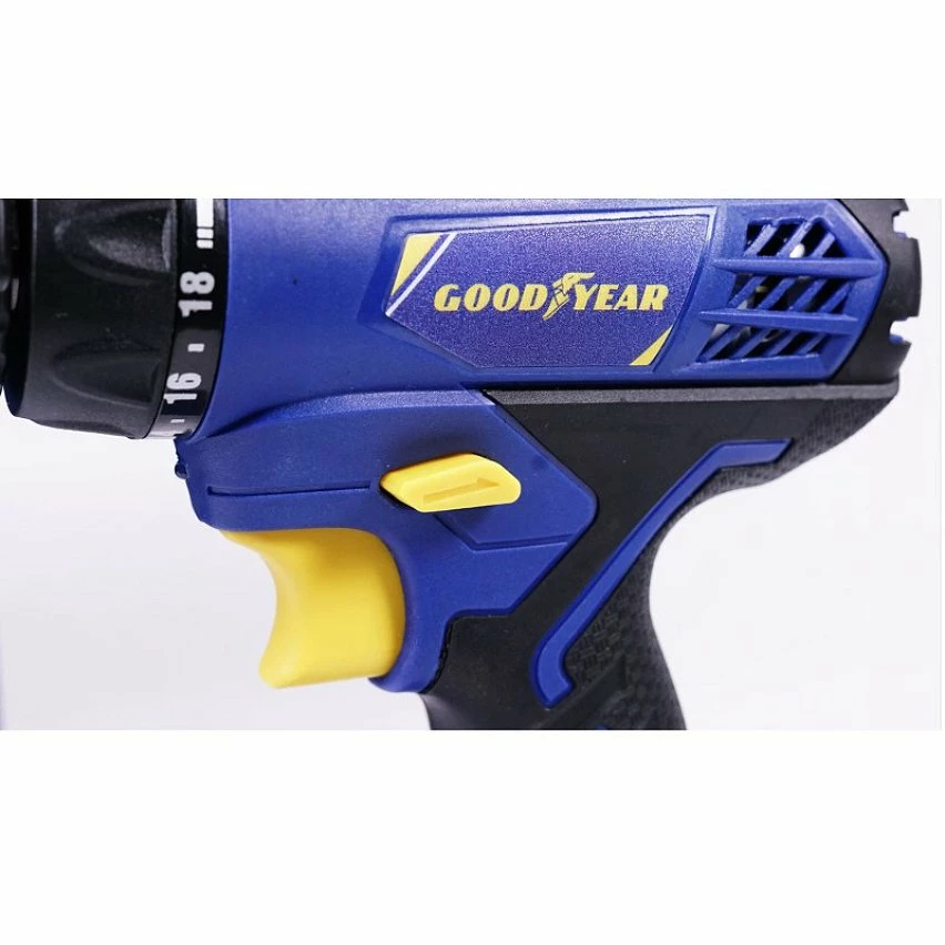 Perceuse-visseuse GOODYEAR sans fil 12V avec 1 batterie 1,3 Ah et son chargeur rapide. Inverseur de rotation pour visser et dévisser Vitesse de rotation variable à la gâchette Éclairage LED pour une meilleure visibilité dans les endroits peu éclairés