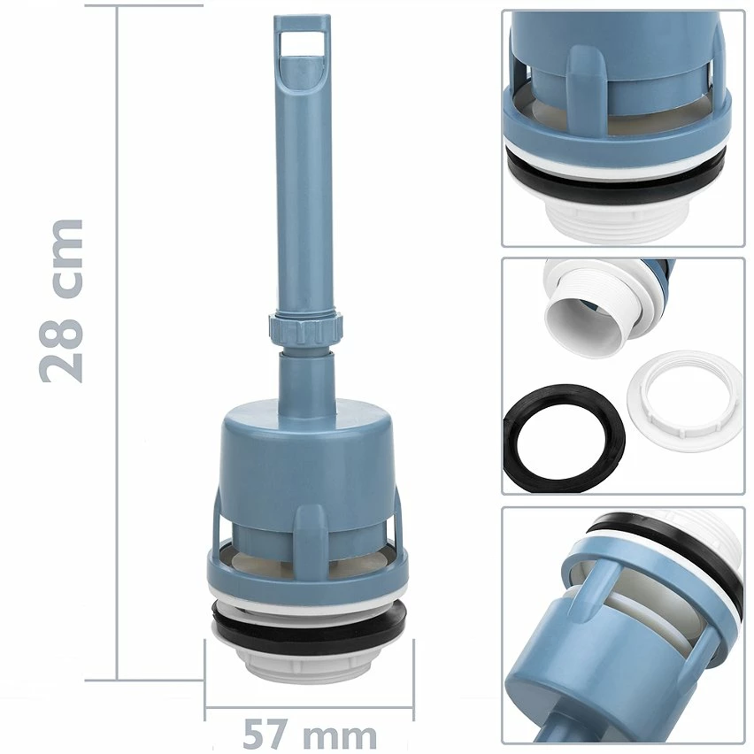 Mécanismes de chasse universels pour citernes, qui garantissent le fonctionnement optimal des toilettes. Ses matériaux de construction durables et inoxydables permettent au système de fonctionner parfaitement pendant longtemps. Montage simple car il ne nécessite pas de démontage du réservoir pour l’installation. Idéal pour remplacer l’ancien mécanisme défectueux. spécifications Déchargeur d’eau manuel pour réservoir WC. Mécanisme de décharge en PVC pour une durabilité maximale. Il dispose d’un joint torique de rétention, ce qui permet d’obtenir une étanchéité totale de l’eau dans la citerne. Uniquement compatible avec les réservoirs bas. Installation facile grâce à un filetage de 57 mm de diamètre.