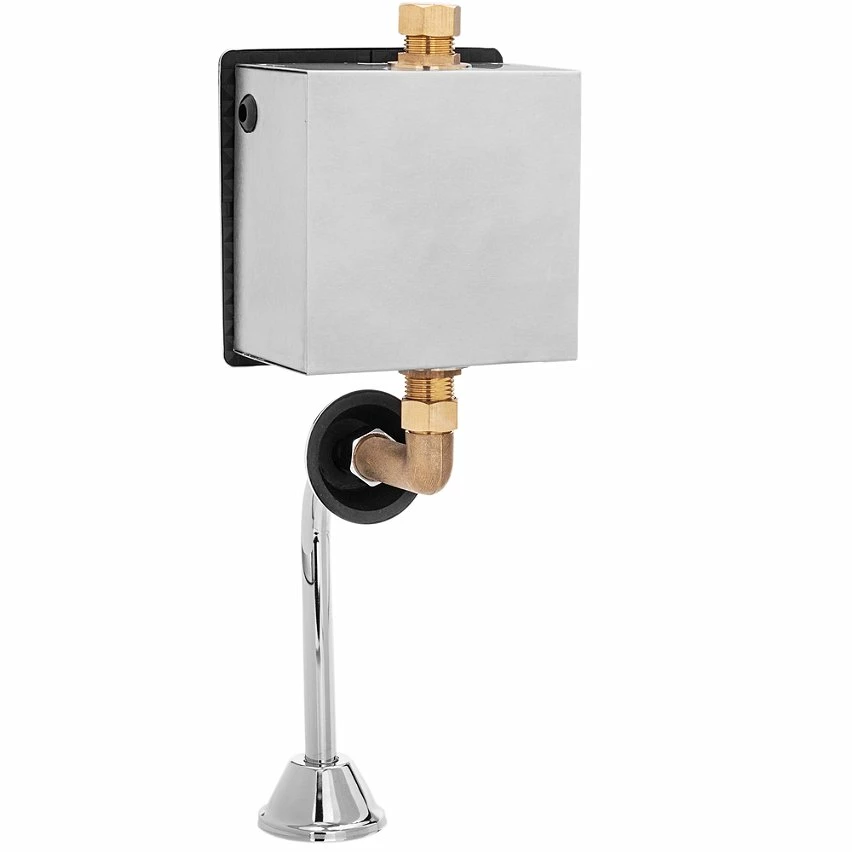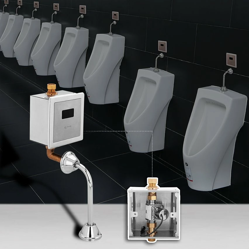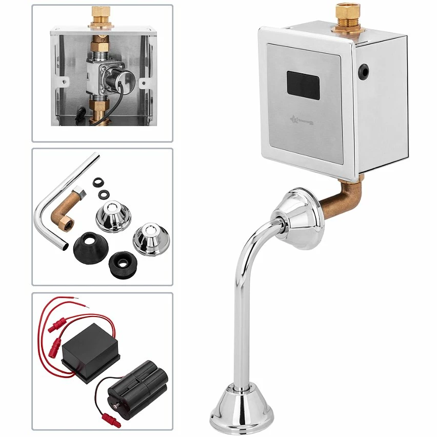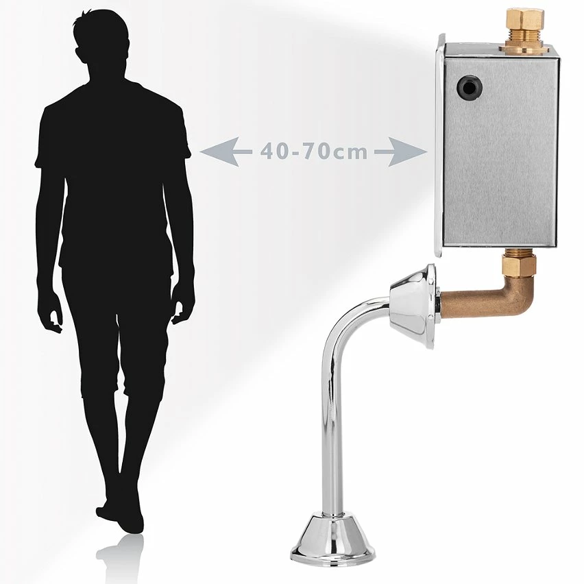 Robinet de chasse automatique pour urinoirs. Son capteur à induction infrarouge permet d’ouvrir ou de fermer le débit d’eau sans avoir à toucher les boutons. Valve automatique en laiton avec une finition chromée brillante, de conception élégante et moderne. Le capteur permet de contrôler le rinçage en fonction de la fréquence d’utilisation, de réduire au maximum la consommation d’énergie et d’eau, et de maximiser les mesures de désinfection et d’hygiène. Idéal dans les toilettes des restaurants, centres commerciaux, aéroports, hôtels, bureaux, usines, centres de santé, écoles, etc. spécifications Robinet de chasse d’eau pour toilettes avec capteur infrarouge, qui permet l’ouverture et la fermeture automatiques du débit d’eau sans avoir à toucher les boutons. De cette manière, le contact avec les toilettes est évité pour une meilleure hygiène. Si la vanne détecte l’utilisateur pendant 3 secondes, elle effectue son premier rinçage de 2 secondes. Le deuxième rinçage a lieu 10 secondes plus tard et dure 4 à 6 secondes, optimisant la consommation d’eau. En fonction de la durée d’utilisation des toilettes, la soupape rince à intervalles réguliers pour un nettoyage supplémentaire, gardant les toilettes propres. En cas de performances médiocres, il rince automatiquement toutes les 24 heures. Electrovanne d’installation simple, encastrée dans le mur. Il a une entrée d’eau mâle de 1/2″ de diamètre en haut et une entrée d’eau femelle de 1/2″ de diamètre en bas. Il fonctionne avec une batterie 220VAC. En option, il permet l’installation de 4 piles alcalines AA (non incluses). Le dispositif comprend une vanne électronique avec une buse de diamètre, une batterie 6VDC en option et deux tuyaux incurvés pour la sortie d’eau. Fabriqué en laiton avec une finition chromée brillante. Idéal pour les urinoirs muraux. Distance de détection approximative du capteur infrarouge: 40-70 cm.