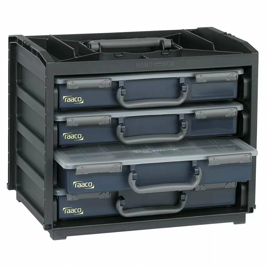 Les quatre boîtes d’assortiment offrent un grand espace de rangement pour toutes sortes de petits articles, tels que des composants de machine, des petits outils, des accessoires ou même vos projets de bricolage. Chaque boîte d’assortiment a des compartiments de différentes tailles et un couvercle verrouillable et des sangles avant, pour maintenir le contenu en place.