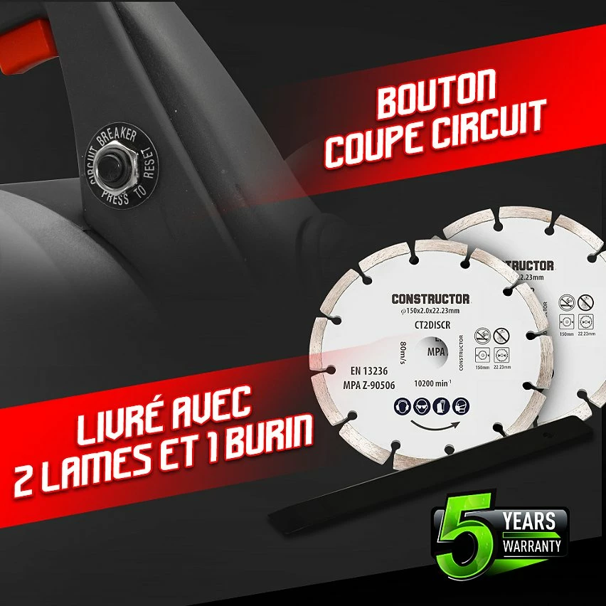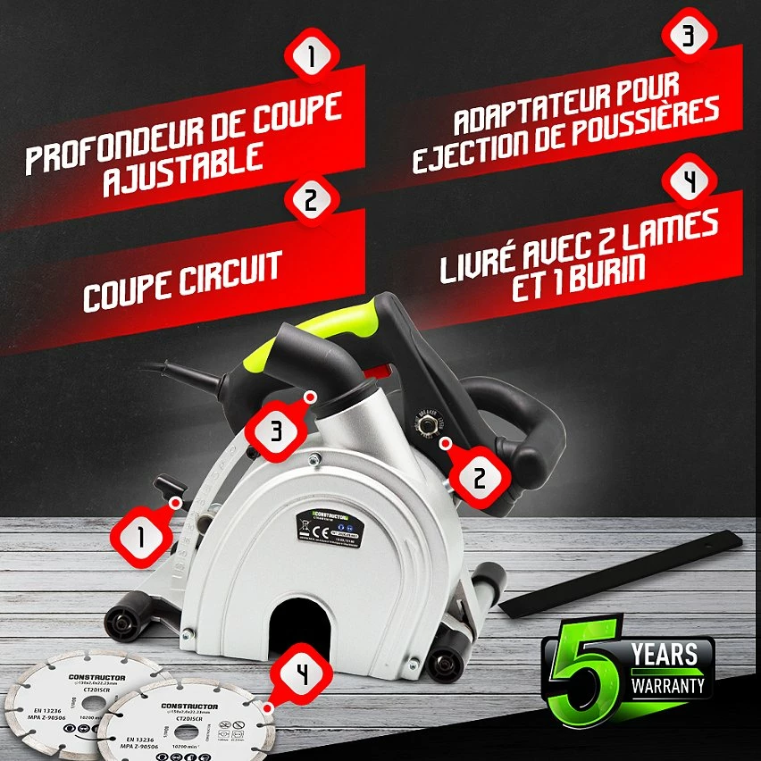 Cette rainureuse à béton Constructor équipée d’un puissant moteur de 1700W sera votre allié idéal pour vos travaux d’électricité ou de plomberie. Elle vous permettra d’effectuer rapidement vos rainures pour des câbles, tuyaux…