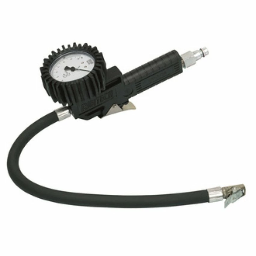 Pistolet de gonflage équipé d’un manomètre indicateur de pression avec graduation de 0-10 bars et d’un couvercle de protection en caoutchouc.