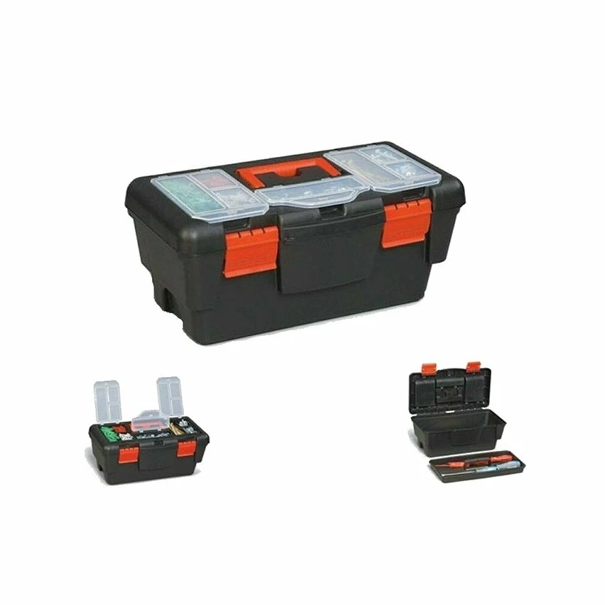 Boîte à outils 47 cm 2 larges attaches pour éviter les ouvertures intempestives en cas de chute. 3 organiseurs sur le couvercle. Plateau porte-outils amovible sur toute la longueur de la boite pour faciliter le rangement des longs outils (scie, niveau). Idéal pour le bricolage , la pêche Dimensions : 47 x 22 x 24 cm