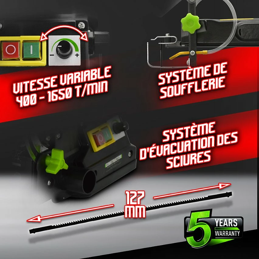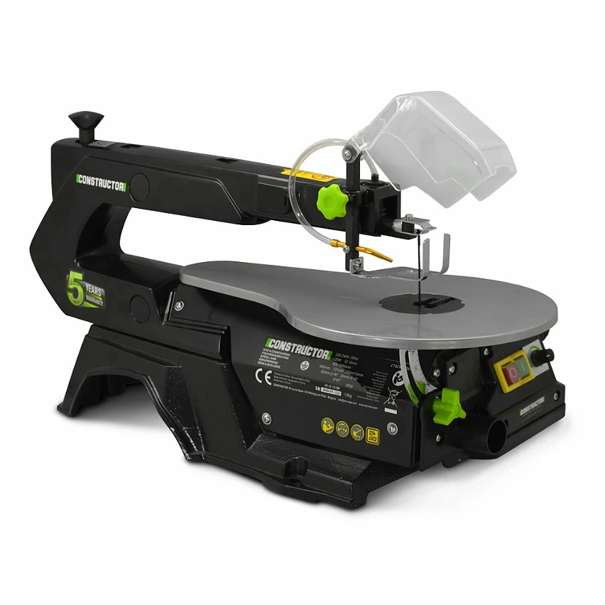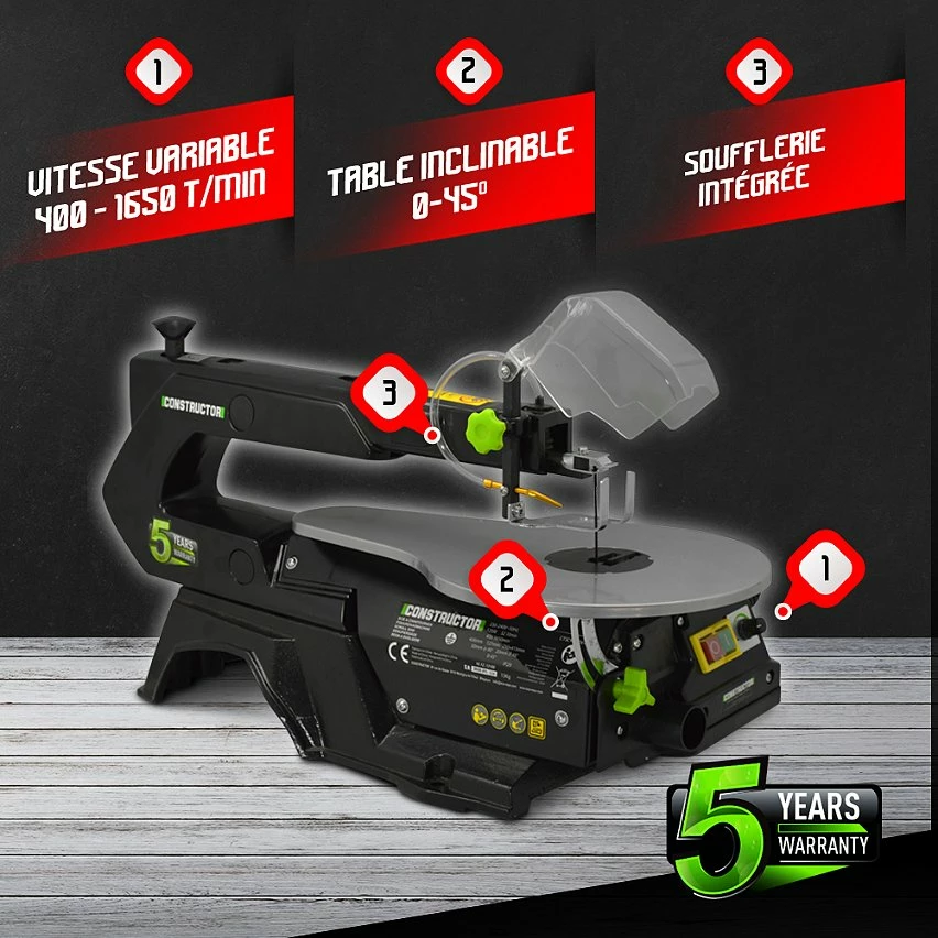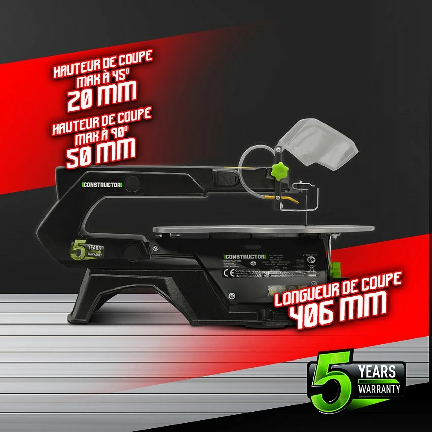 Cette scie à chantourner 120 W de la marque Constructor est idéale pour la coupe rapide et précise du bois. Elle permet de couper parfaitement en cercle. Elle possède une vitesse variable de 400 à 1650 tours par minute et dispose d’une hauteur de coupe de 50 mm à 90° et de 20 mm à 45 °. Très pratique, cette scie à chantourner est équipée d’un système d’évacuation des sciures.