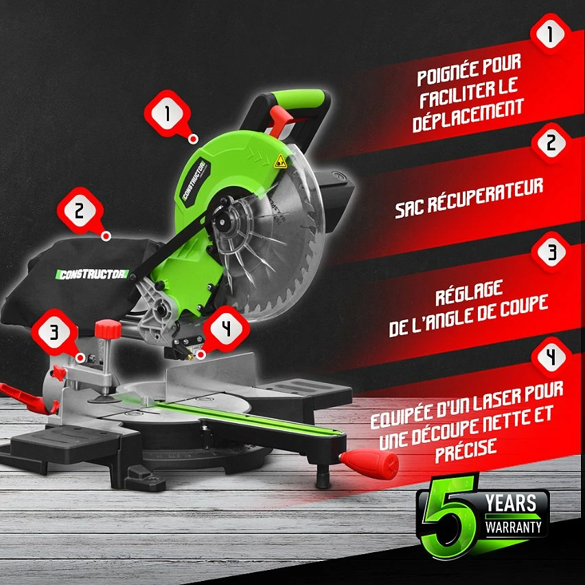 Cette scie à onglets radiale 1800 W de la marque Constructor, composée d’une lame de 254 mm de diamètre (36 dents), est idéale pour la découpe du bois, de panneaux MDF,… Grâce à un système de coulisse à double barre, elle dispose d’une capacité de coupe étendue et d’une haute précision.