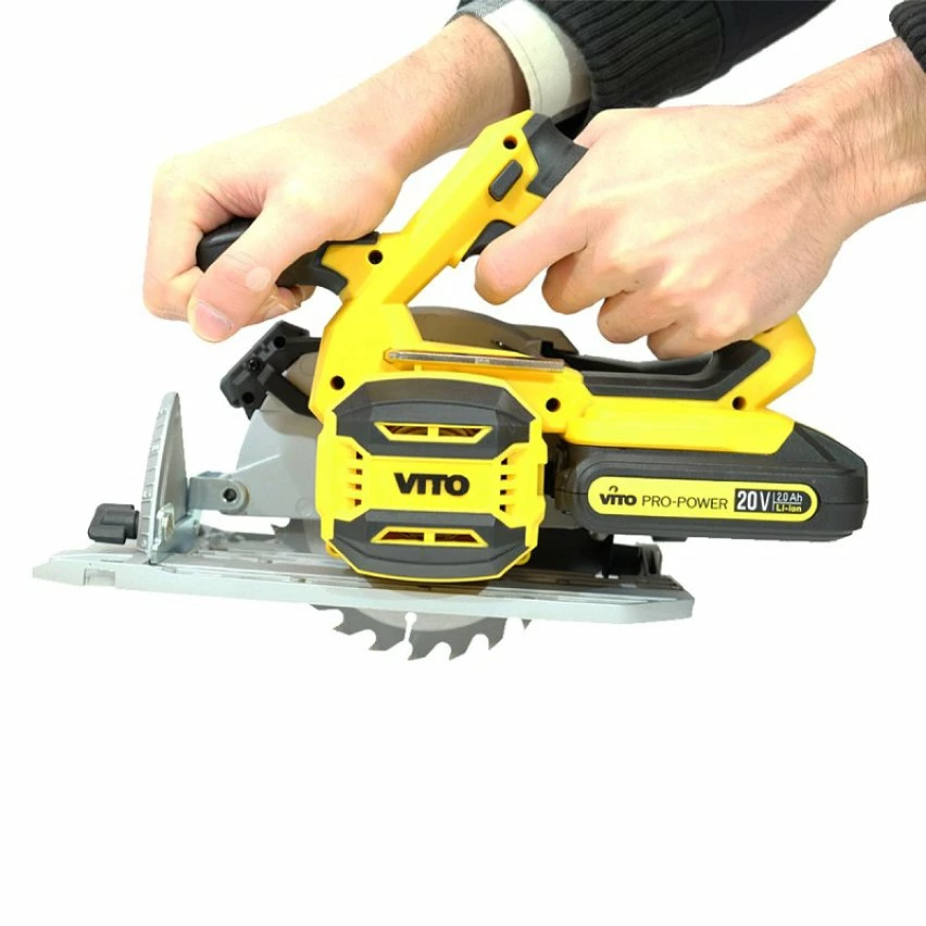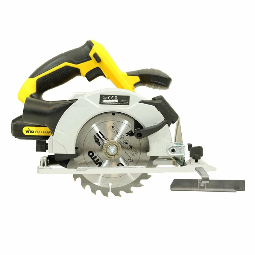 Scie circulaire sans fil VITOPOWER 20 V équipée d’un disque de 150 mm de diamètre. Vitesse de 4200 tours/minute. Possède un réglage d’inclinaison jusqu’à 90º et son corps est en aluminium.