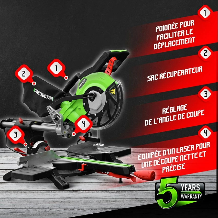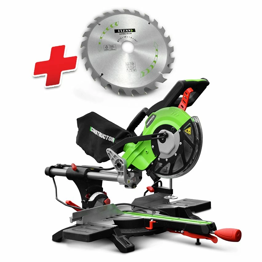 Cette scie à onglets radiale 1800 W de la marque Constructor est parfaite pour la découpe de bois, de panneaux MDF, … Elle dispose d’une lame de 210 mm de diamètre (24 dents) et elle possède une longueur de coupe max de 31 cm et une profondeur de coupe max de 6 cm. Son guide laser permet de réaliser des découpes nettes et précises.