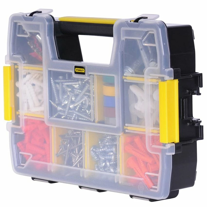 La boîte à outils SortMaster de la marque Stanley est une unité d’organisation unique qui comporte des loquets latéraux verrouillables qui permettent à l’utilisateur de fixer en toute sécurité jusqu’à 3 organisateurs ensemble. L’organisateur SortMaster est livré avec des séparateurs amovibles qui permettent un haut degré de personnalisation pour les pièces petites et plus grandes.