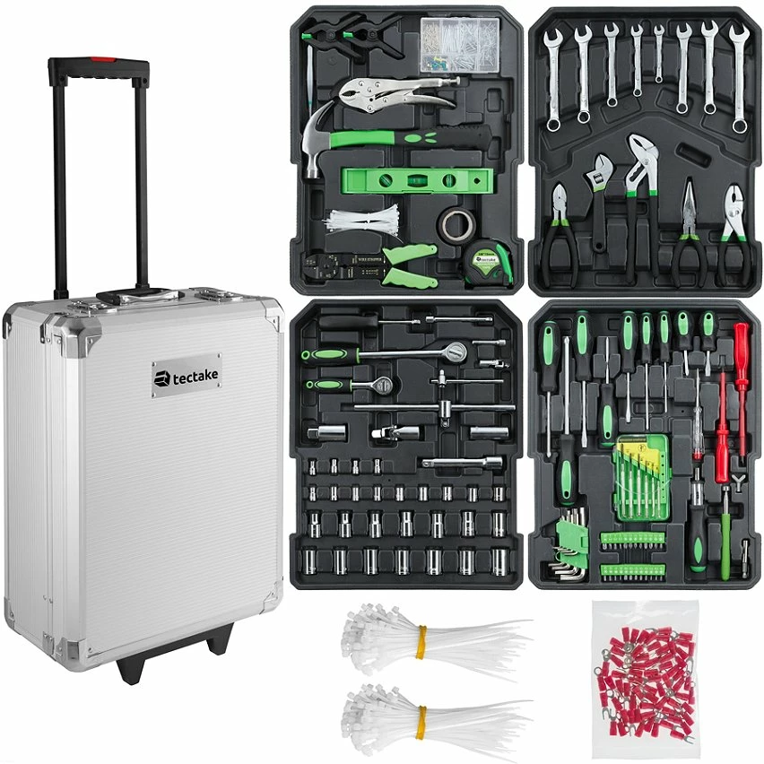 Boite à Outils, Coffret à Outils, Caisse à Outils, Malette, Valise à Outils Trolley en Aluminium 899 Pièces TECTAKE. • Ce coffret à outils est idéal pour tous les bricoleurs. • Tous les outils sont rangés de manière fonctionnelle sur quatre niveaux. • Les poignées ergonomiques assurent une transmission de force optimale et un travail précis. • Grâce aux roues et à la poignée télescopique, vous pouvez emporter avec vous la caisse à outils mobile dotée de coins renforcés en acier pour travailler à l’extérieur. • Avec cette boîte bien équipée, vous avez tous les outils à portée de main.