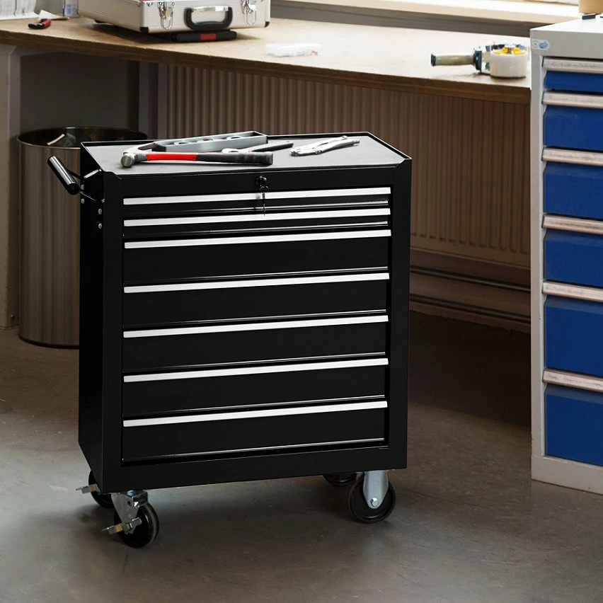 Servante d’Atelier Chariot à Outils avec 7 Tiroirs 69 cm x 33 cm x 79 cm TECTAKE. Voici le compagnon idéal de votre atelier ! Vous pouvez y ranger chaque outil à sa place et le retrouver facilement ! Le chariot à outils dispose de 7 tiroirs spacieux, verrouillables et montés sur des glissières à billes. Qu’il soit utilisé dans un atelier professionnel ou pour du bricolage, ce système de rangement vous est toujours utile. La serrure empêche l’ouverture des tiroirs pendant un trajet et protège contre tout accès non autorisé. Les tiroirs et le plateau de ce chariot revêtu par poudre sont équipés de tapis antidérapants. 4 Roues stables facilitent les manœuvres et permettent une utilisation mobile.