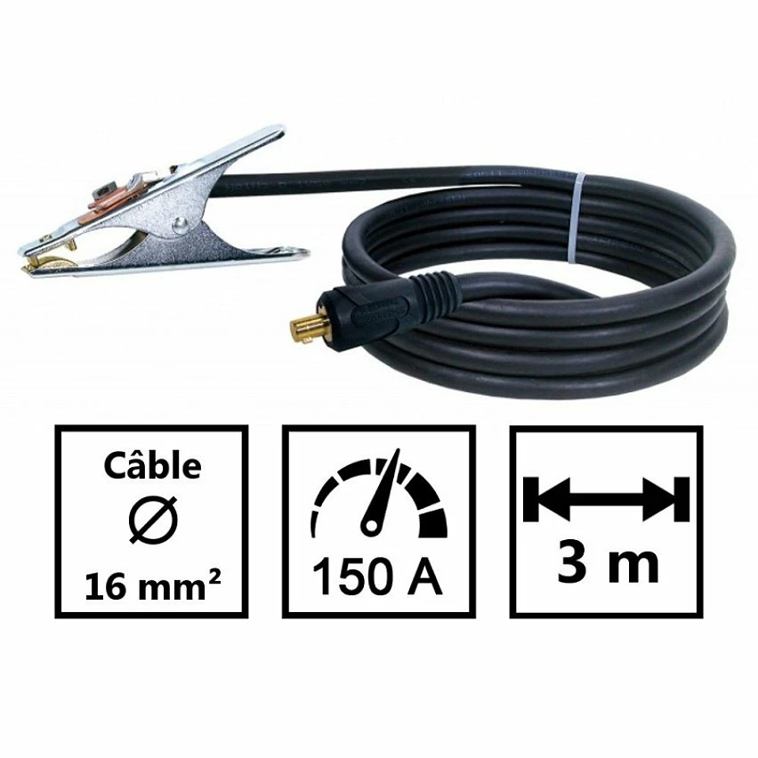 Le câble de masse SARPREEN de 16mm² et de longueur 3m possède une pince de masse de 200A et un connecteur TEXAS TX25 pour poste à souder.