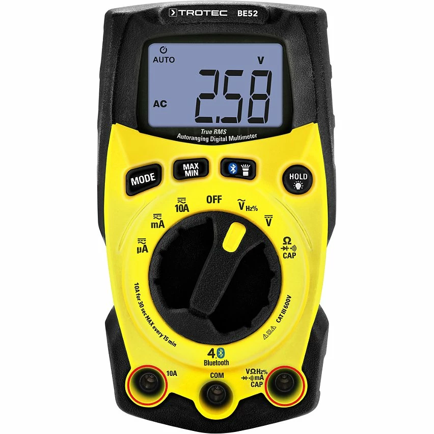 TROTEC Multimètre numérique RMS réel BE52 mesure de tension continue et alternative et de courant continu (DC) et alternatif (AC). Fonction voltmètre. Fonction ohmmètre (résistance). Fonction RMS réel : mesure précise par détermination directe de la valeur efficace vraie.