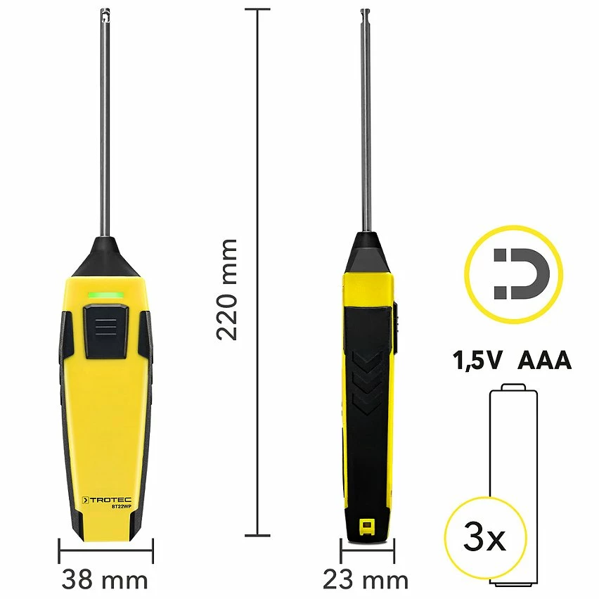 Sonde thermométrique connectée TROTEC BT22WP Mesure de la température, gestion via application et connexion à smartphone : Ce thermomètre numérique doté d’une sonde ultra-fine est parfait pour mesurer la température de gaz non agressifs dans des endroits difficilement accessibles, des conduits et gaines d’aération et de ventilation, ainsi que pour contrôler la température de liquides non agressifs.