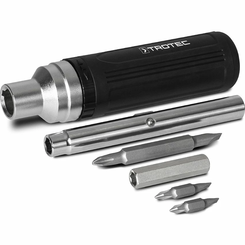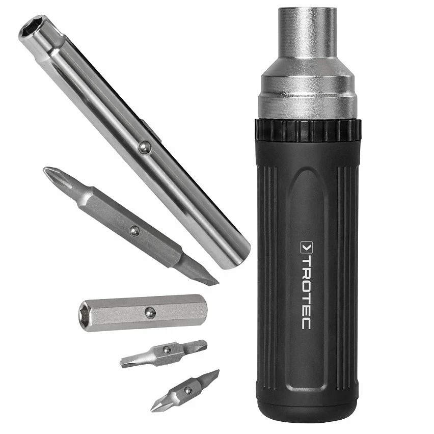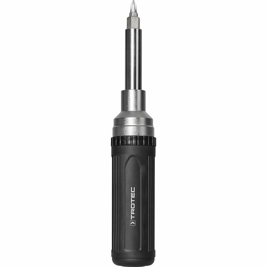 TROTEC Tournevis à cliquet 9 en 1 robuste et compact pour professionnels et particuliers. 6 embouts et 3 douilles hexagonales permettant de réaliser une multitude de travaux de vissage et comprenant des vis de divers types et longueurs.