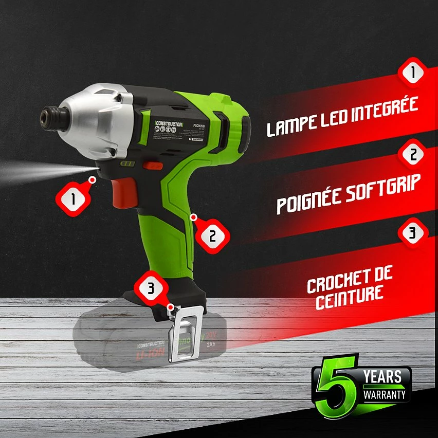 Avec cette visseuse à chocs sur batterie 20 V de la marque Constructor, effectuez vos travaux de vissage sans effort. Elle possède un couple maximal de 140 Nm ainsi qu’une vitesse variable 0-2400 tours par minute. Légère et dotée d’une poignée soft grip, elle est extrêmement maniable. Sa petite taille permet d’atteindre les endroits les plus difficiles.
