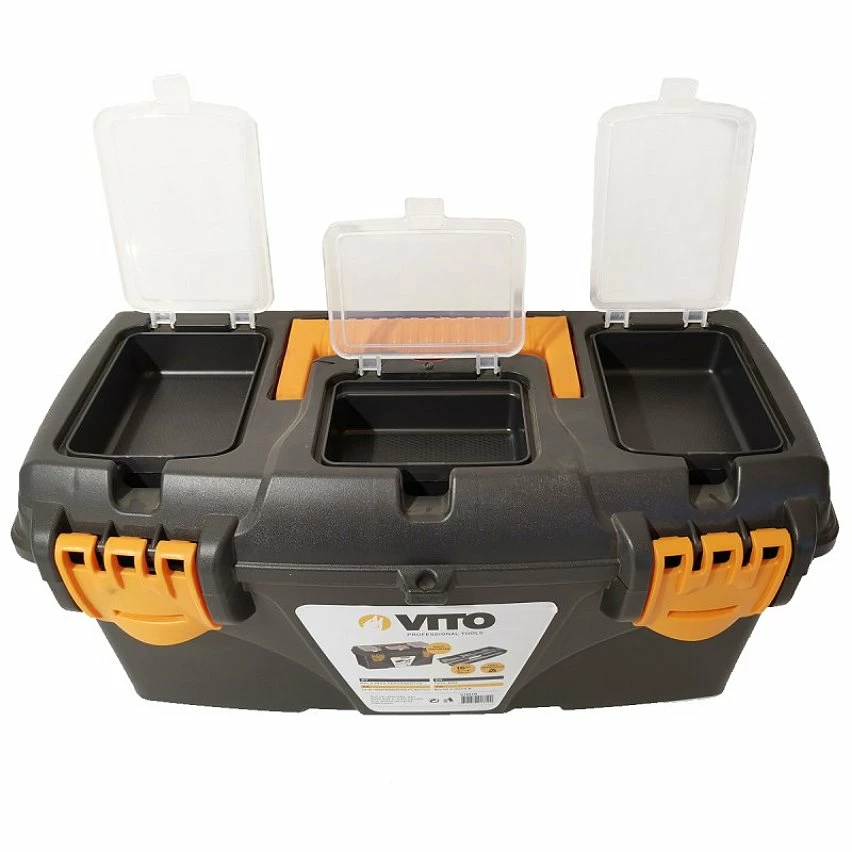 Caisse outils 16″ VITO robuste. Ses dimensions 410 x 209 x 195 mm. Caisse à outils multi-rangement haute résistance VITO – Polyvalente, vous l’utiliserez pour ranger, emporter ou stocker.